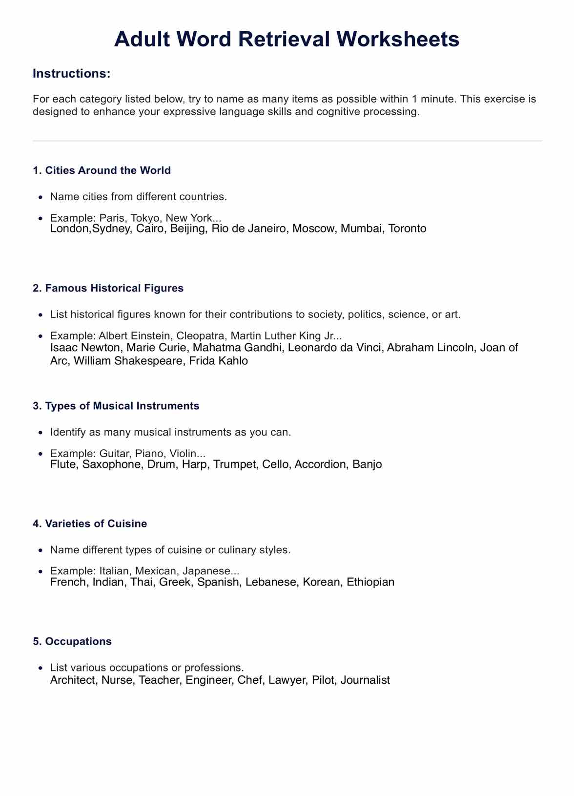 Enhance adult word retrieval with specialized worksheets: engaging, effective activities tailored for adult language improvement and speech refinement.