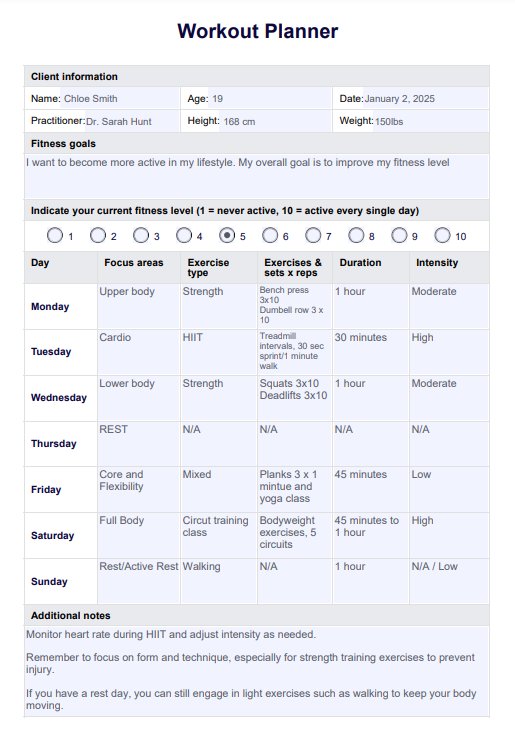 A Workout Planner includes sections for personal information, fitness goals, and a detailed workout plan with exercises, sets, reps, and notes. It also provides space for healthcare professional input and additional recommendations to ensure a tailored fitness approach.