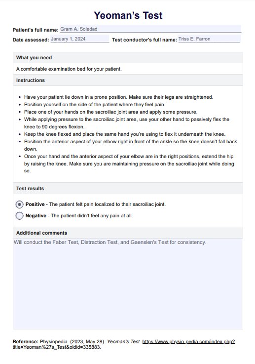 The Yeoman's Test is a physical examination technique used to assess for sacroiliac joint dysfunction or inflammation (sacroiliitis). A positive result, indicated by pain in the sacroiliac region, suggests potential joint involvement. Although it does not confirm a diagnosis, it should be followed by a further evaluation to rule out other conditions.