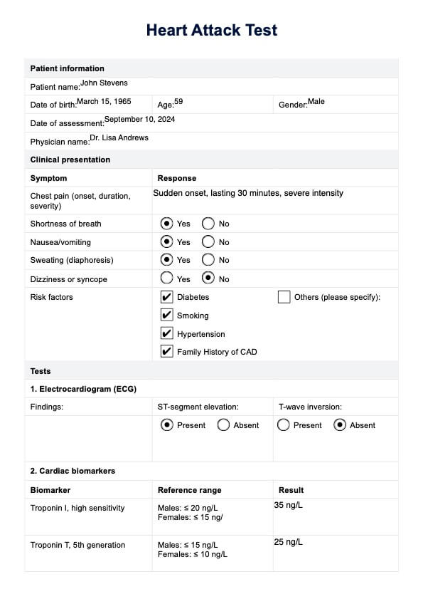 ใช้เทมเพลตการทดสอบหัวใจวายของเราเพื่อปรับปรุงการวินิจฉัยด้วยการตรวจคลื่นคลื่นไฟฟ้าหัวใจ การทดสอบ Troponin และ echocardiogramตรวจสอบการตรวจจับและรักษาอาการหัวใจวายที่ถูกต้อง