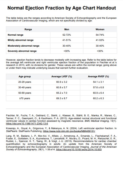 เศษส่วนการขับออกปกติ (EF) โดยทั่วไปจะอยู่ระหว่าง 52-72% สำหรับผู้ใหญ่ชายและ 54-74% สำหรับผู้ใหญ่หญิงโดยไม่คำนึงถึงอายุ แม้ว่าจะสังเกตเห็นการเพิ่มขึ้นเล็กน้อยในกลุ่มอายุที่มีอายุมากกว่า