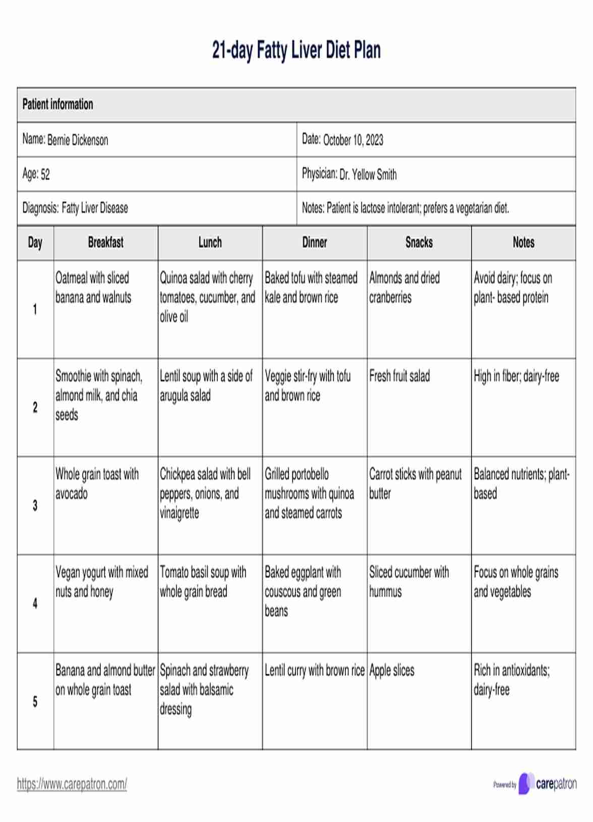 21 Günlük Yağlı Karaciğer Diyet Planınız için Carepatron kullanmanın faydalarını keşfedin. Hastalarınız için ücretsiz bir PDF şablonu indirin.