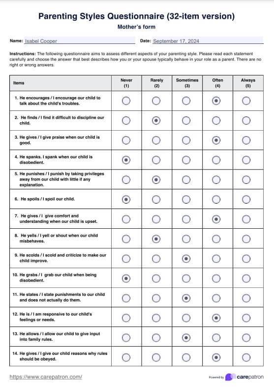 Hastalarınızın bir Ebeveynlik Stilleri Anketi vererek çocuk yetiştirme yaklaşımlarının farkında olmalarına yardımcı olun. Ücretsiz bir kopya için buraya tıklayın.
