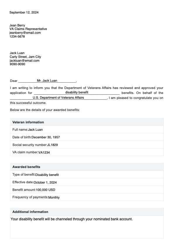 Hastaların VA faydalarının ayrıntılarını anlamalarına yardımcı olmak için referans olarak bu VA Faydaları Ödül Mektubu şablonunu indirin.
