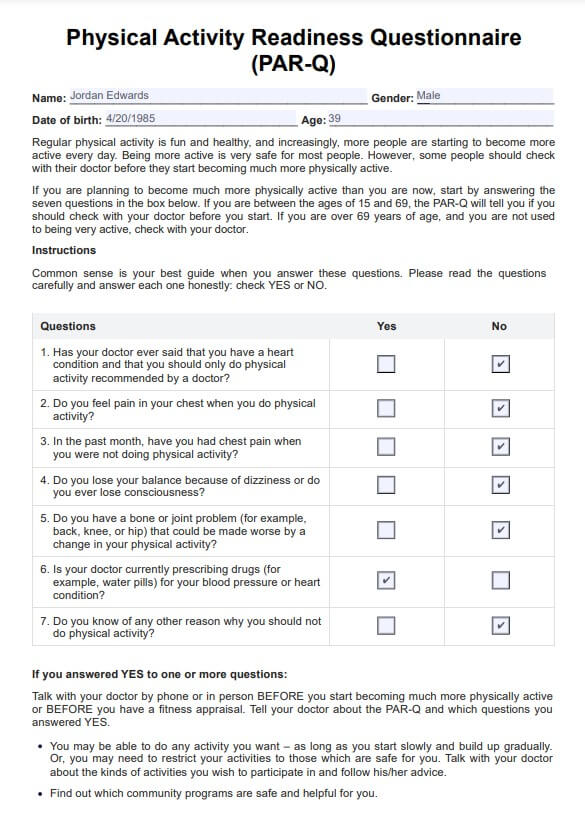 PAR-Q 的解釋很簡單-如果個人回答一個或多個問題「是」,建議他們在進行體能活動前諮詢醫療保健專業人員。這有助於確保評估個人的健康狀況,並且可以對其運動計劃進行任何必要的預防措施或修改。