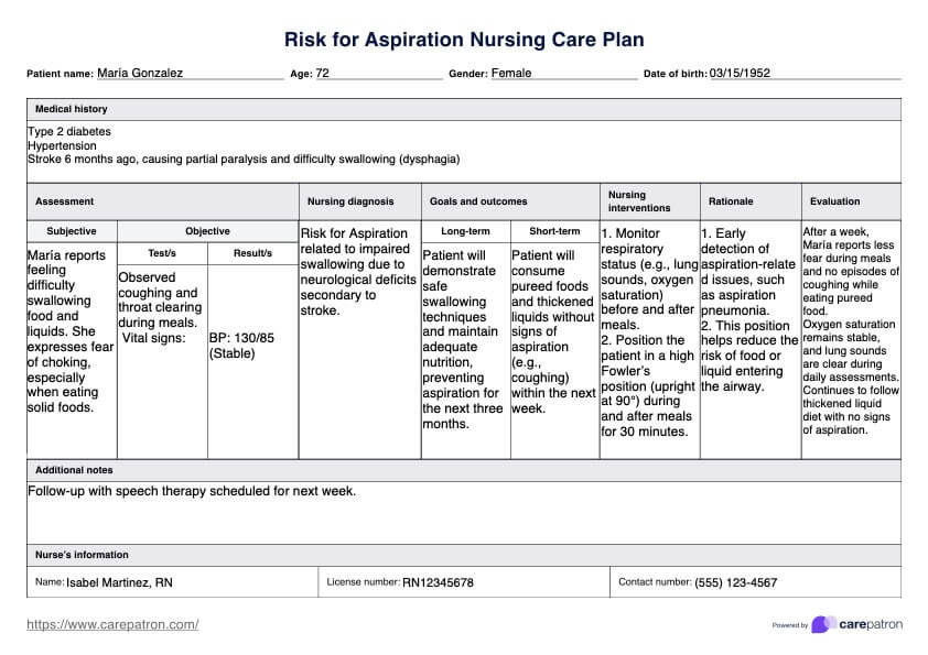 吸入風險護理計劃範本在各種醫療保健環境中使用,針對由於困難、意識障礙或神經系統疾病等疾病引起吸入風險的患者使用。